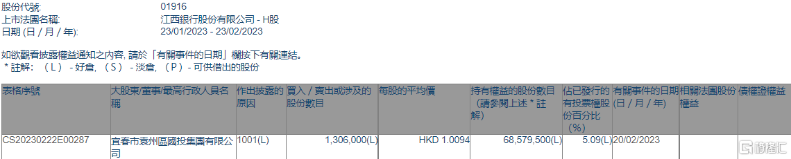 格隆汇2月23日丨根据联交所最新权益披露资料显示,2023年2月20日,江西银行(01916.HK)获宜春市袁州区国投集团有限公司在场内以每股均价1.0094港元增持130.6万股,涉资约131.83万港元。