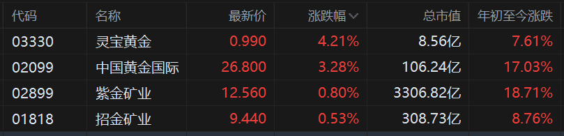 格隆汇1月13日丨灵宝黄金涨超4%,中国黄金国际涨超3%,股价创7个月新高价,紫金矿业、招金矿业均有涨幅。